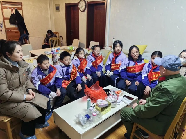 在党员老师唐郡,团员老师杜永倩的带领下,队员们走进社区退伍老战士朱爷爷家中,一起帮助打扫卫生、整理房间。在84岁老红军朱爷爷家中,孩子们围坐倾听他讲战火年代的革命故事,并为朱爷爷捶背,老人备受感动。金都华庭社区工作人员说:“孩子们的陪伴让老人感受到社会的关爱,这样的活动既暖心又有意义。”