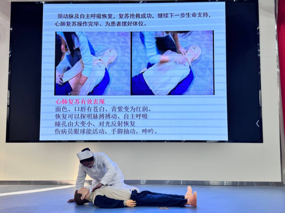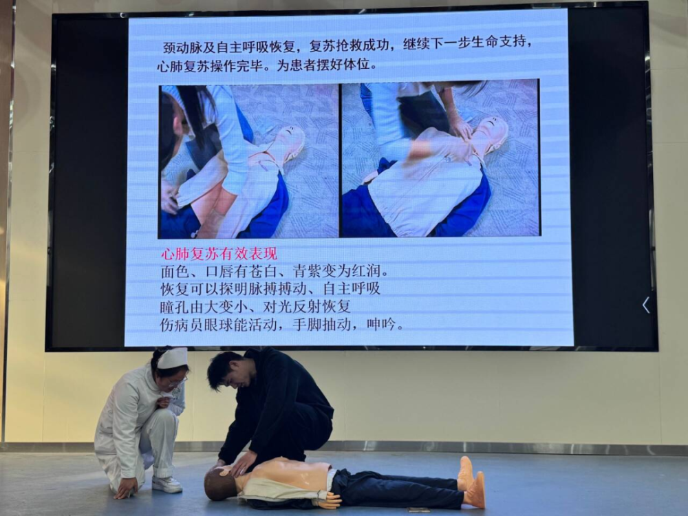 在实操演练环节,参训教师分组进行模拟练习,医生与护士全程指导,耐心纠正操作细节,解答疑惑。活动现场互动热烈,教师们认真练习,反复打磨动作标准性。参与培训的老师表示:“通过手把手的学习,不仅掌握了急救技能,更增强了应对突发状况的信心。这样的培训对校园安全至关重要。”