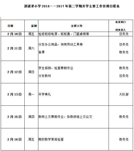 逍遥津小学2016——2017年第二学期开学主要工作安排日程表