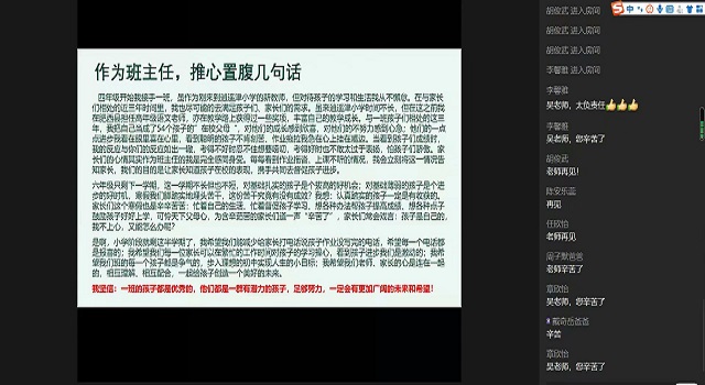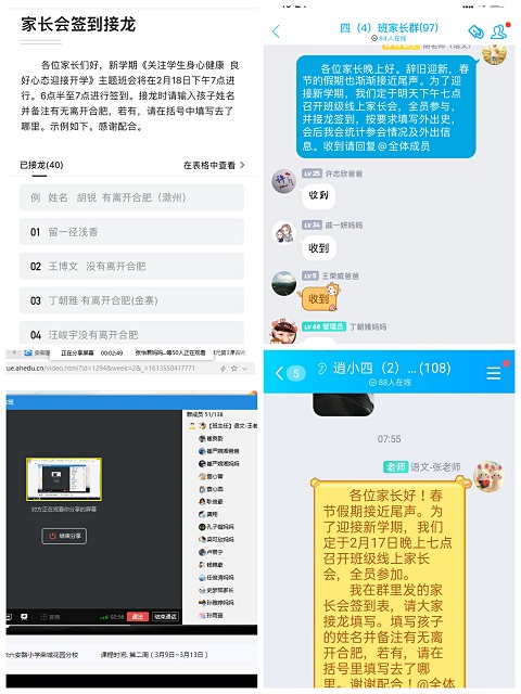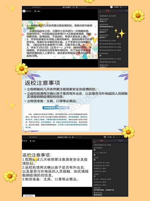 基于各班班情,结合当前疫情防控要求和开学前期的工作要求,家校交流会借助QQ群课堂、腾讯课堂等线上交流平台分班级开展,有以下几个板块。