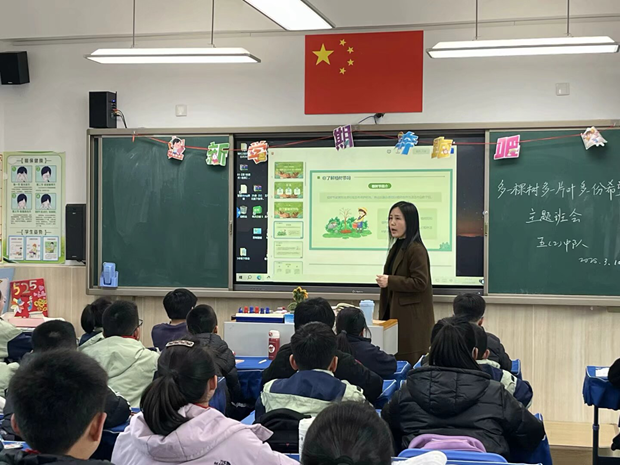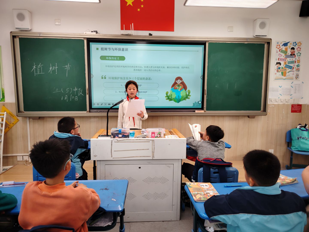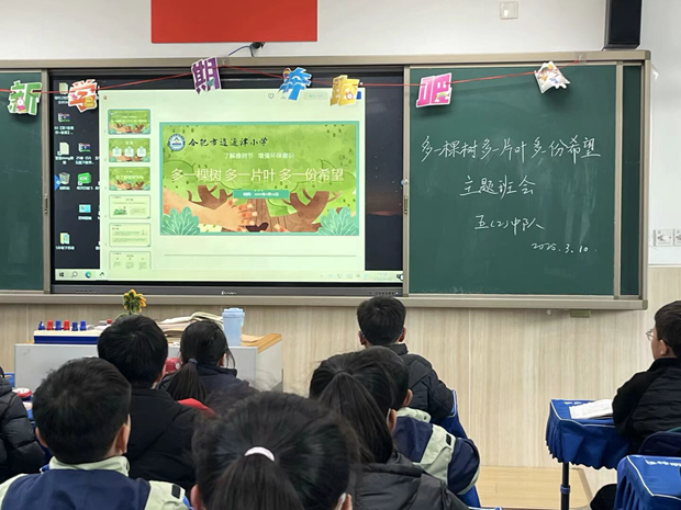 下午,一场以“多一棵树,多一片叶,多一份希望”为主题的班会活动在全校展开。主题班队会上,辅导员老师向队员们介绍了植树节的来历、植树造林的意义及爱护树木的常识,队员们认真聆听。