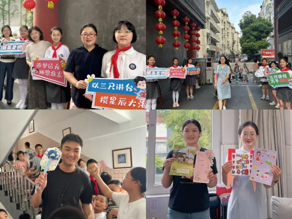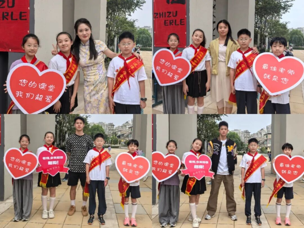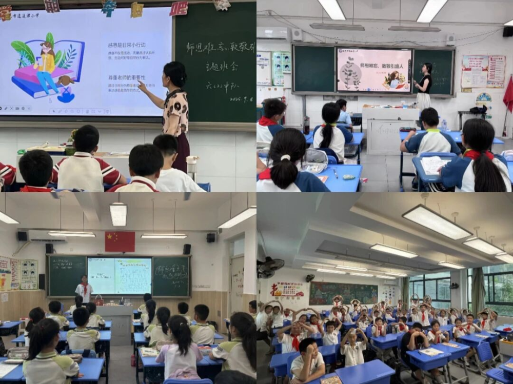 各班队开展的教师节主题班会,成为师生深度交流的“温馨小课堂”,更紧扣党建带队建“育新人、传美德”的核心导向,将节日的温暖融入德育教育。班队辅导员老师们提前准备了“老师的一天”主题照片集——从清晨到校准备课件,到课堂上生动授课,再到课间解答队员疑问,每一张照片都满含细节,大家还通过合唱歌曲、班级口号等形式,把祝福唱出来、念出来,温馨的氛围里,德育理念自然融入师生互动,让“师恩”二字变得具体而温暖。