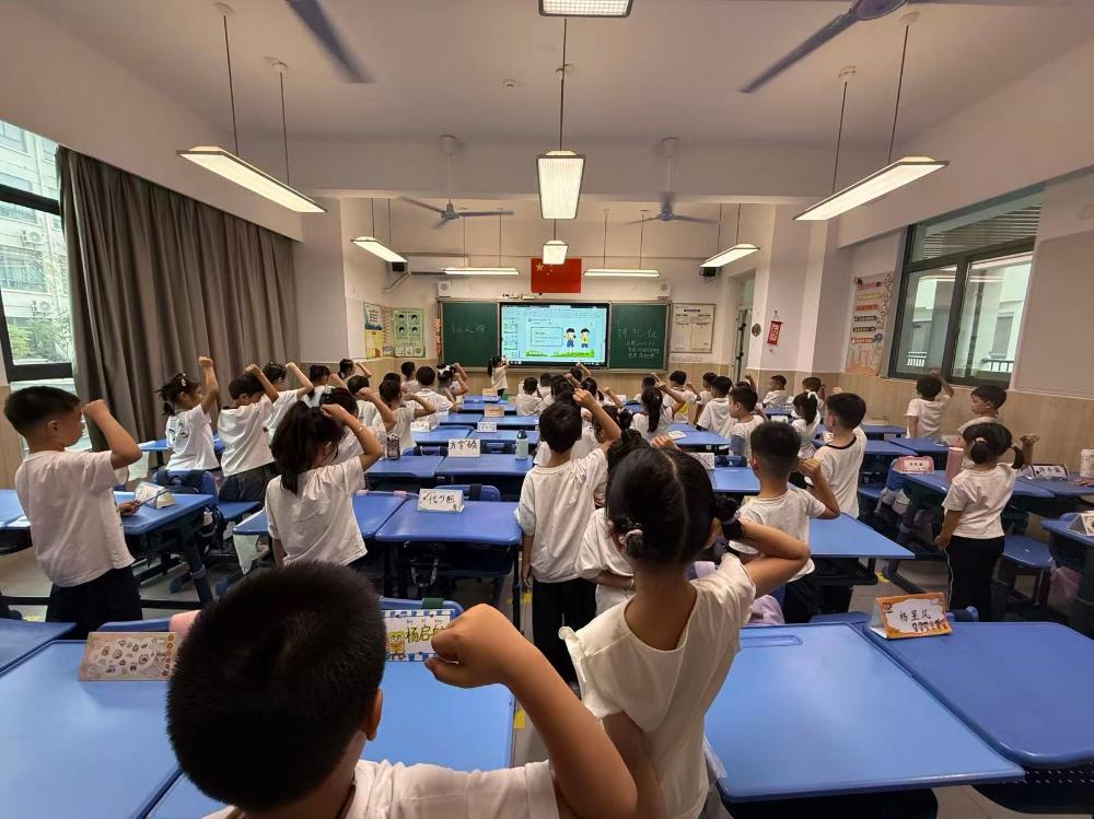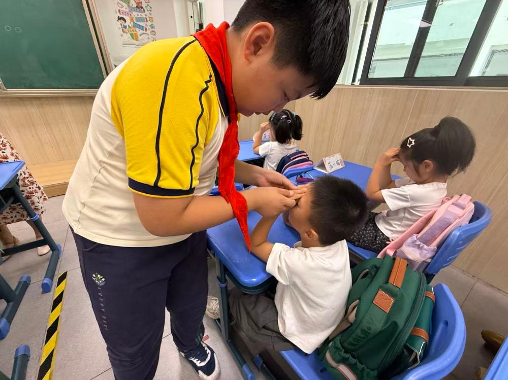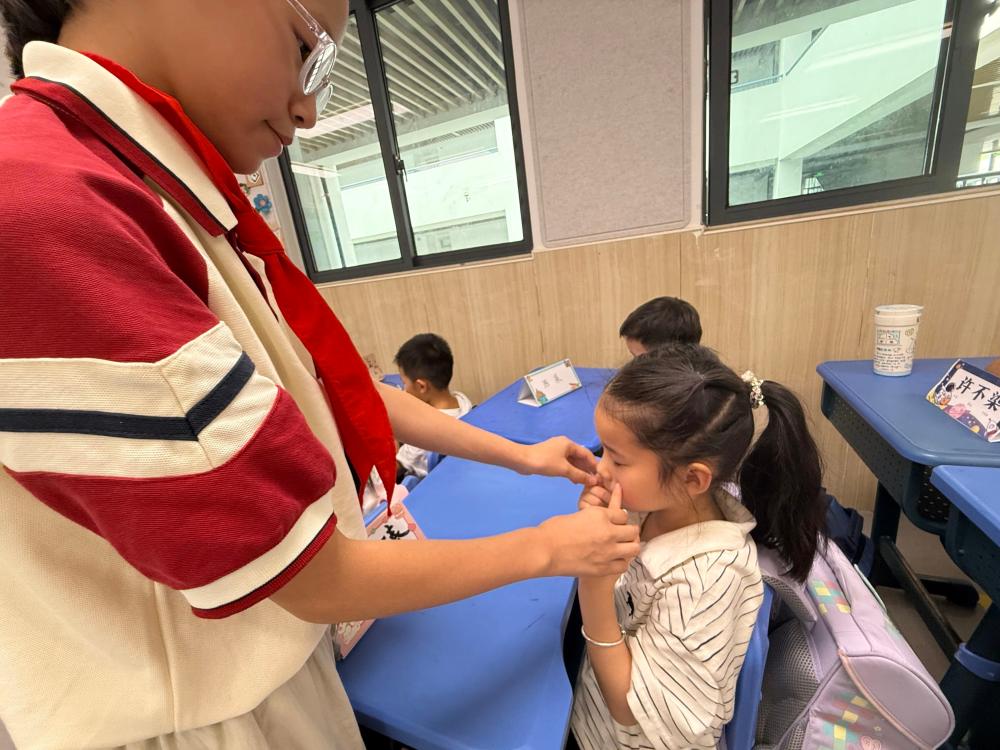 在班会现场,为帮助大家养成科学护眼习惯、切实掌握正确的眼保健操作法,大队委们提前认真研习每一个穴位的按压要点与动作规范——这既是“小榜样”的责任,更是党建引领下“传帮带”精神的生动体现。他们用清晰易懂的语言讲解,用精准标准的动作示范,低年级的队员们参与热情特别高涨,全神贯注地跟着哥哥姐姐模仿动作;遇到不懂的地方,会立刻举手积极提问。发现有队员找不准穴位时,大队委们会耐心蹲下身,轻轻帮他们调整手部位置;看到动作标准的队员,也会第一时间竖起大拇指点赞鼓励,现场互动融洽又温暖,每一个细节都透着“文明互助”的气息。