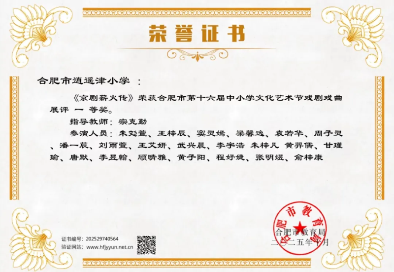 近日,2025 年上半年合肥市第十六届中小学文化艺术节系列活动获奖名单已揭晓。合肥市逍遥津小学凭借出众的表演喜获佳绩:获奖作品《京剧薪火传》。参演学生:朱彣萱 、王梓辰、窦灵嫣、梁馨逸 、袁若华、周子灵、潘一莀、刘雨萱、王艾妍、武兴晨、李宇浩、朱梓凡、黄羿儒、甘瑾瑜、 唐默、李昱翰、顾晴雅、黄子阳、程妤婕,张明煜、俞梓康。指导教师:宗克勤。