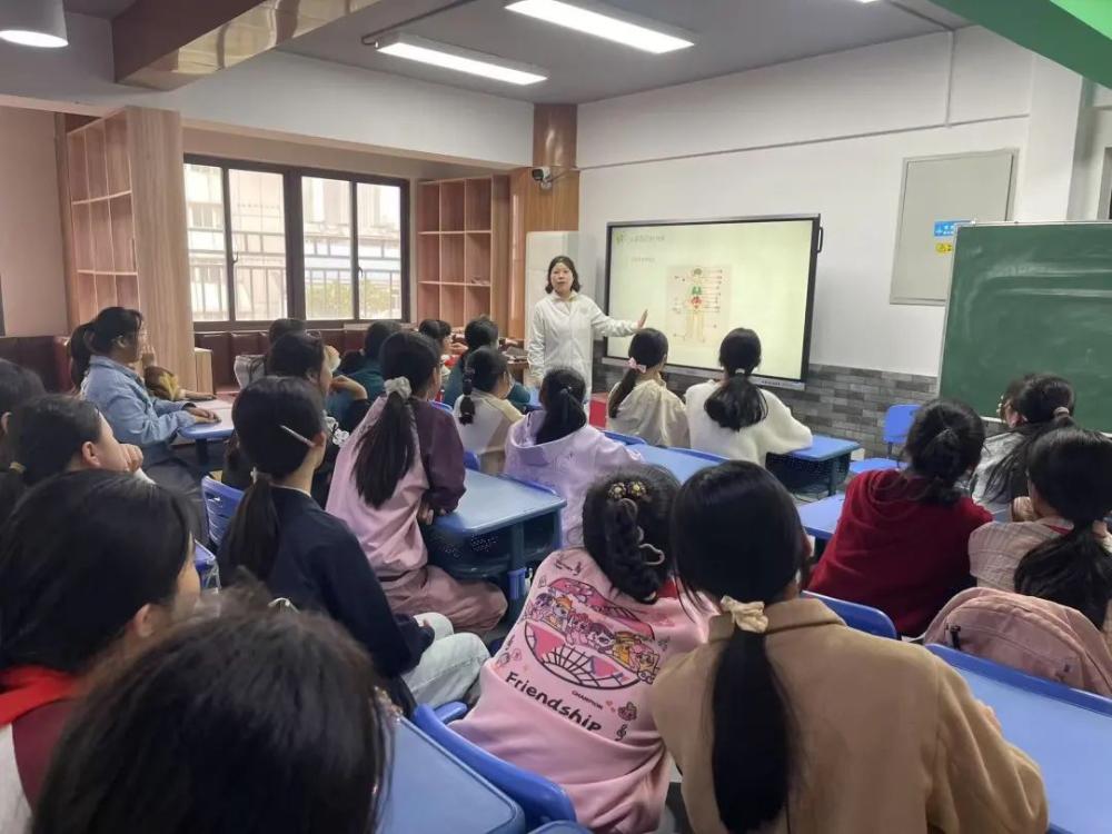 女生专场由庐阳区逍遥津第二社区医院专职医生主讲,讲座伊始,主讲人用亲切温和的语言迅速拉近了与学生的距离,为学生营造了轻松愉悦的氛围。她借助生动的图片、有趣的视频,用通俗易懂的语言,聚焦青春期身体变化、自我保护等话题,帮助女生们消除内心的紧张与羞涩,引导学生学会科学地进行自我护理,学会辨别和预防身边的潜在危险,并深入剖析青春期学生常见的心理问题,如情绪波动大、自我意识增强、人际交往困惑等。同时,主讲人还分享了实用的心理调适方法,鼓励同学们学会自我调节,以积极乐观的心态应对青春期的种种挑战。
