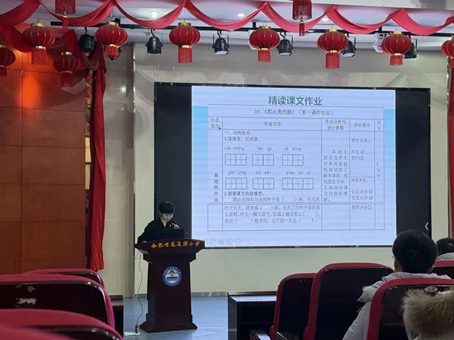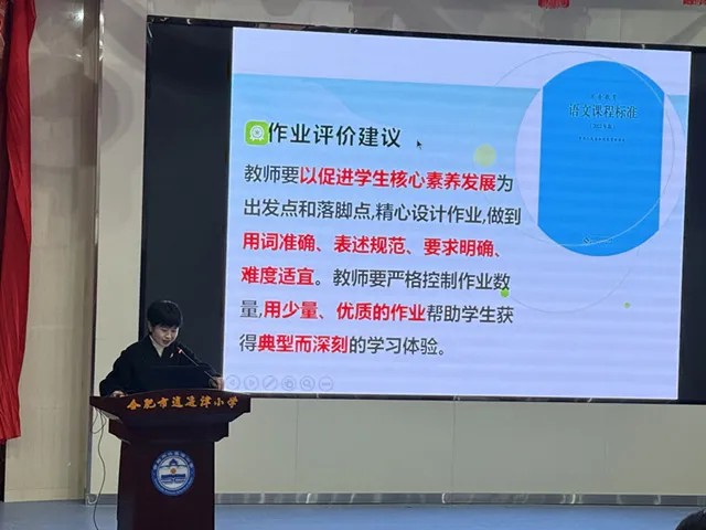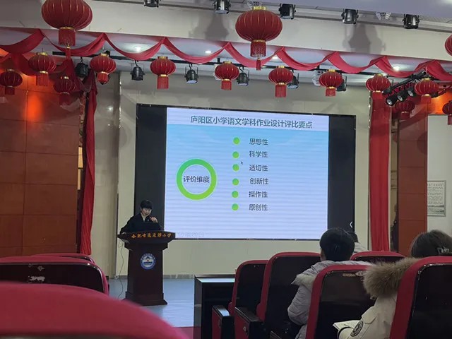 此外,王少群校长还带领老师们深入解读了庐阳区小学语文学科作业设计评比要点,从思想性、科学性、适切性、创新性、操作性和原创性等多个维度进行了剖析。她强调,作业设计要依纲据本,吃透《评价量表》,根据学情合理控制作业容量与难度,创新作业形式与内容,通过图文并茂的方式提升作业趣味性。同时,她详细介绍了作业设计比赛流程,为有意参赛的教师提供了清晰的指引。