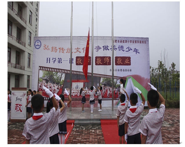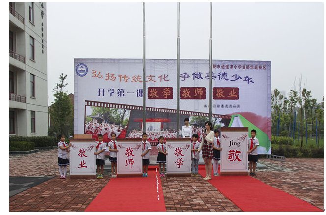 新学期承载新梦想,新学期开启新希望。2014年9月1日上午八时,逍遥津小学金都华庭校区的全体师生欢聚在庄严的国旗下,隆重举行“弘扬传统文化,争做美德少年”主题开学典礼。此次的开学典礼以“敬”为核心,围绕着“敬学 敬师 敬业”三个关键词,让所有人都眼前一亮,耳目一新。 庐阳区教育体育局朱晓燕科长、家长代表、媒体朋友和新校全体师生共同见证了这一时刻。