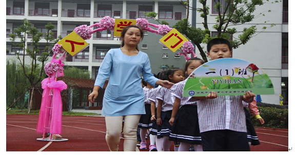 “走过‘入学门’,你们就成为一名小学生了!”一大早,当一年级的新生们背着书包来到学校时,他们惊喜地发现,学校为他们准备了隆重的欢迎仪式,有列队迎接的哥哥姐姐们,还有镶满花朵的象征着身份变换的“入学门”。孩子们兴奋地从入学门下经过,充满希望地迈向新生活。与此同时,这也是“敬学”的一种仪式。当孩子们怀着对教育的虔诚,对知识的敬畏走进入学门的时候,也就意味着他们从此踏上了追求知识的旅程。