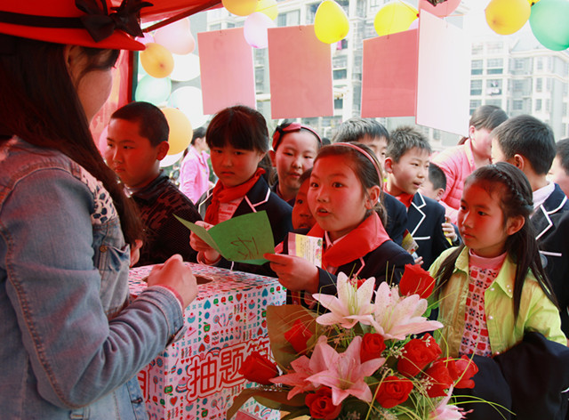 “亡羊补牢”的下一句是什么,一位同学答到:“为时未晚”!于是她的“阅读基金卡”上就多了一个红印章。此外,因为抽到的题目序号逢十,她还获得了一次砸金蛋的机会,金蛋里的奖项是一个记录本,带来又一个惊喜。在读书节的游园活动环节,全校各班级在校园广场设立了19个阅读闯关专区,例如“数字说书名”、“成语填字”、“偏旁转转转”、“名句竞猜”等。每名学生手中均有一张“阅读基金卡”,通过参加这些闯关活动赢取“阅读基金卡”积分,积分可以在总服务台兑换奖励。