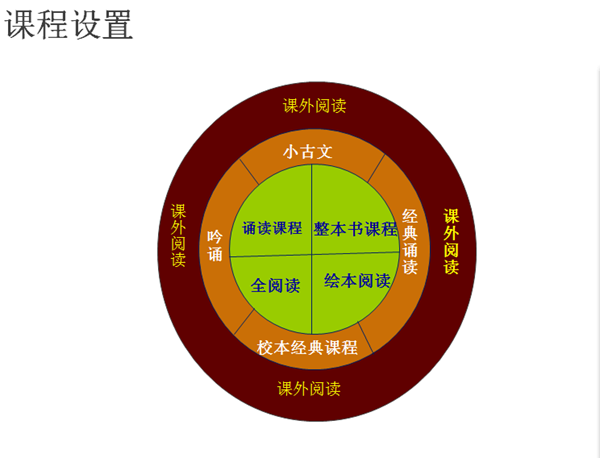王老师就从组织架构、课程安排、教师研修、课程评价四个方面详细地介绍了逍遥津小学的阅读工作。其中,王老师提到逍遥津小学的阅读课程,可以用这样一个图示来呈现。外圈:学生大阅读。中圈:小古文阅读、中华素读、“庐州文化”读本,诗词阅读,等;内圈:经典阅读课程。我们的经典阅读课程的设置,以四大板块为主,其他为辅。这四大板块具体来说,日有所诵、全阅读、整本书阅读、绘本四大课程。