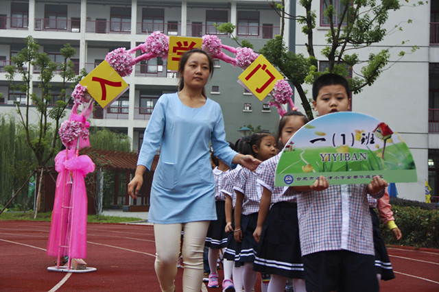 “走过‘入学门’,你们就成为一名小学生了!”一大早,当一年级的新生们背着书包来到学校时,他们惊喜地发现,学校为他们准备了隆重的欢迎仪式,有列队迎接的哥哥姐姐们,还有镶满花朵的象征着身份变换的“入学门”。孩子们兴奋地从入学门下经过,充满希望地迈向新生活。与此同时,这也是“敬学”的一种仪式。当孩子们怀着对教育的虔诚,对知识的敬畏走进入学门的时候,也就意味着他们从此踏上了追求知识的旅程。