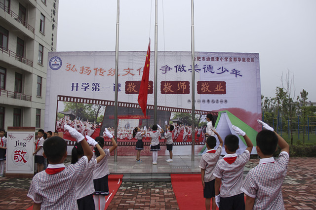 新学期承载新梦想,新学期开启新希望。2014年9月1日上午八时,逍遥津小学金都华庭校区的全体师生欢聚在庄严的国旗下,隆重举行“弘扬传统文化,争做美德少年”主题开学典礼。此次的开学典礼以“敬”为核心,围绕着“敬学 敬师 敬业”三个关键词,让所有人都眼前一亮,耳目一新。 庐阳区教育体育局朱晓燕科长、家长代表、媒体朋友和新校全体师生共同见证了这一时刻。