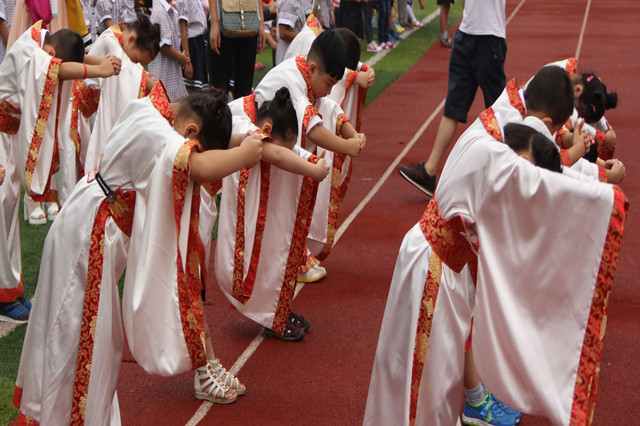 庄严的升旗仪式之后,王悦老师带来了珍贵的开学第一课——敬学 敬师 敬业。她通过讲故事的方式深入浅出地传达了“敬”的精神。在说到“敬师”一词时,穿插举行了简单而不失庄重的拜师仪式,孩子们用最古朴的作揖表达了对老师们的尊敬之意。