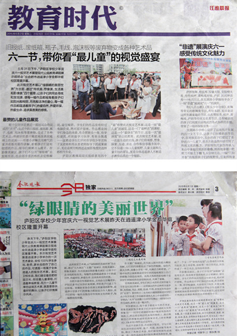 “绿眼睛”是全体逍遥津老师送给孩子们一份特殊的节日礼物。一如合肥市庐阳区教体局局长殷硕景在艺术展前言所说2015年逍遥津小学视觉艺术展是一场以儿童视野、儿童主题和儿童主创的展览,是全体逍遥津人不断追求教育品质的一个缩影,更是一粒火种,一盏明灯,他将带领所有孩子走向更明亮的那方。