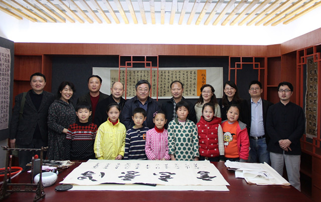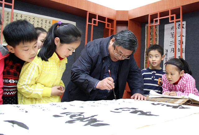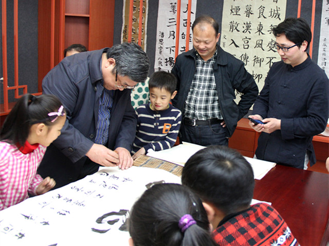 李明阳一行走进正在上课的少年宫墨香社,悠悠琴韵,浓浓墨香,二十几个孩子带胡道金老师带领下端坐案前,手持毛笔,或急或徐,或轻或重,或顿或提,正在习字。