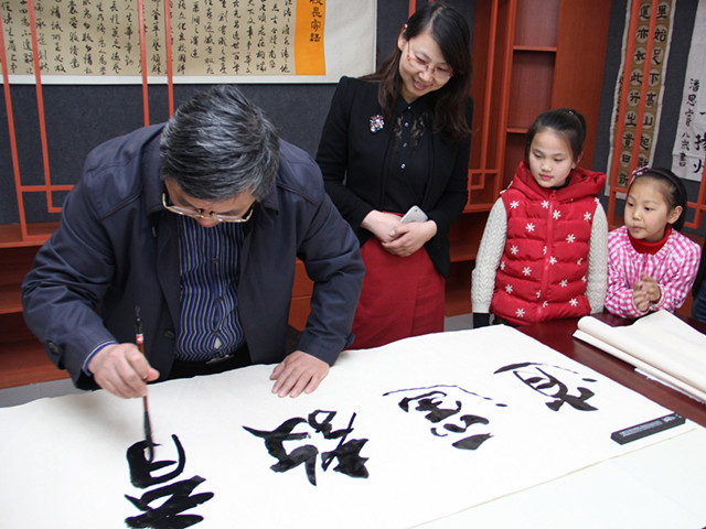 李明阳走到老师、孩子们中间。当听到介绍这些孩子最大的只有三年级,就能写这么一手好字时十分高兴,受现场气氛感染李督学当堂挥毫,欣然题字。几个好学的孩子立刻围了过去。