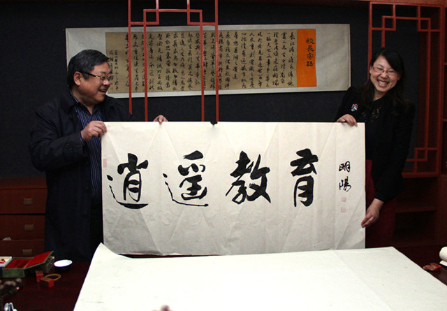 李明阳对学校能营造良好的写字氛围,师生热情投入参与,写字教学效果明显表示赞赏,欣然写下“逍遥教育”祝逍遥津小学的发展越来越好!
