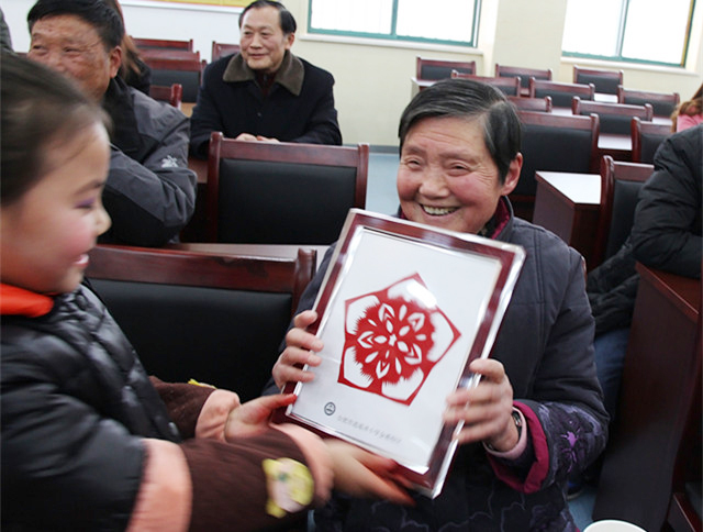 剪纸社团、书法社团的孩子也不甘示弱,趁表演间隙,将自己准备好的剪纸作品、书法对联递到老人手中,并敬上标准的队礼。老人将孩子的作品拿在手里端详了很久,抚摸着这些虽有些稚嫩,但带着满满心意的作品,有的老人们开始哽咽,开始抹眼角……