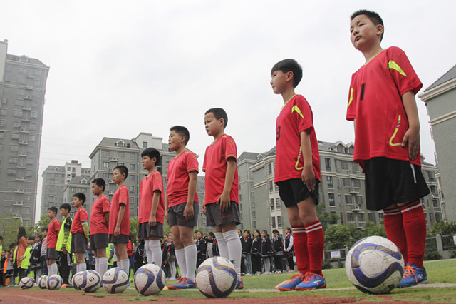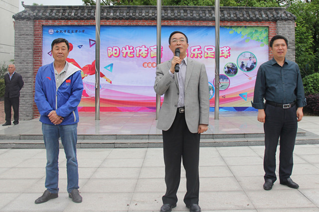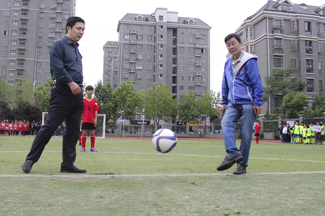 为了增强学生体质,培养青少年拼搏进取、团结协作的体育精神为宗旨,为了让足球运动成为学校的特色体育项目,成为学生健康阳光的生活方式。逍遥津小学在5月7日举办首届足球文化节开幕仪式。庐阳区教育体育局体育科科长李长保宣布首届足球文化节开幕,体育运动专家章林老师和校长姚明伟为揭幕战的两支球队开球。