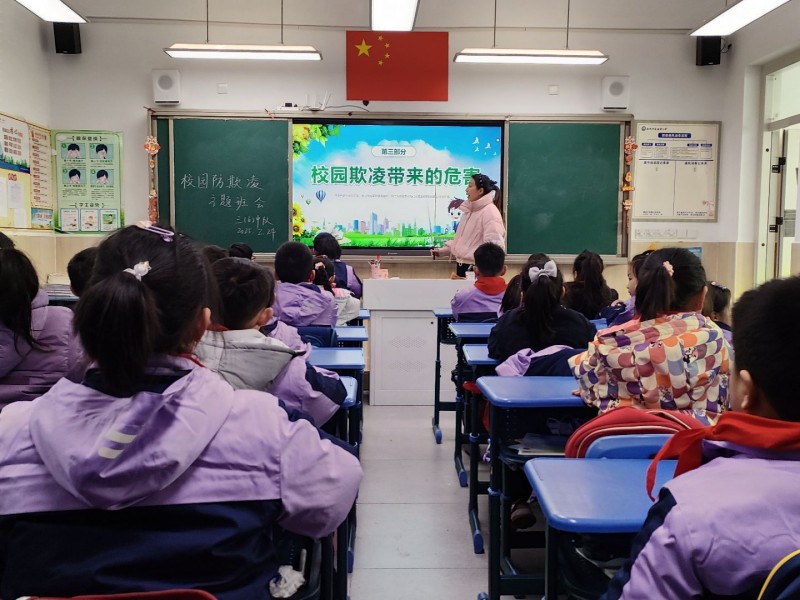 下午班队课上,各班队开展了“拒绝校园欺凌,守护美好校园”主题班会活动,在校园内营造出了浓厚的反欺凌氛围。班队课伊始,班队辅导员老师通过精心制作的PPT,以直观的图片、生动的视频案例引入主题,向队员们详细阐释了校园欺凌的概念、常见形式以及严重危害。从肢体**、言语辱骂,到社交孤立、网络欺凌,一个个真实发生的案例让队员们深刻认识到校园欺凌绝非小事,它不仅会对受害者的身体造成伤害,更会在心灵上留下难以磨灭的创伤,影响受害者的学习、生活以及身心健康发展。